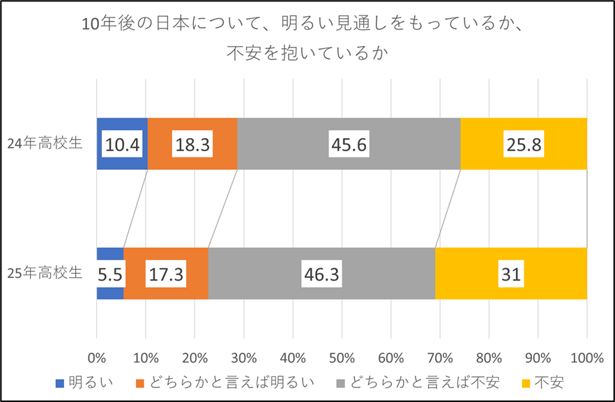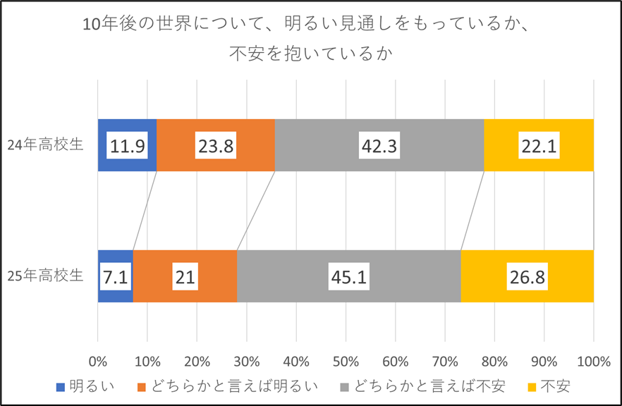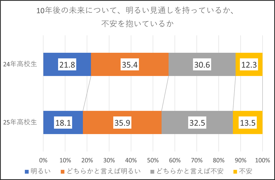 最初に示すのは、「10年後の未来について、明るい見通しを持っているか、不安を抱いているか」というアンケート結果である。