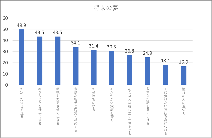 といずれもが大きく減少している。わずか1年の間に大幅に減少したことは、ある意味興味深い結果である。高校生が、このような認識を持っている中で、将来の夢を聞いてみたのが、次のグラフである。
