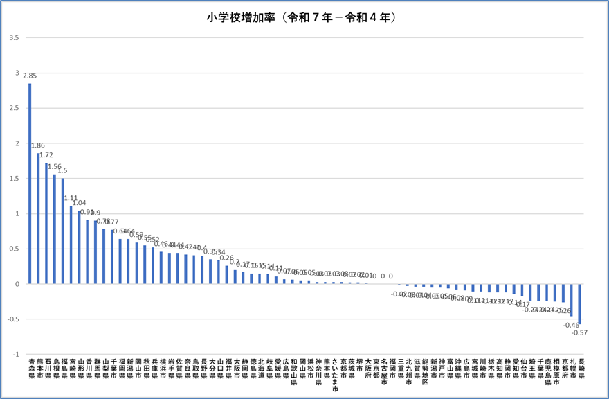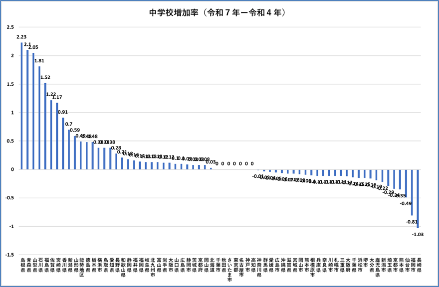 かなり自治体によって差があることがわかる。因みに、中学校の増加率は、以下の通りである。