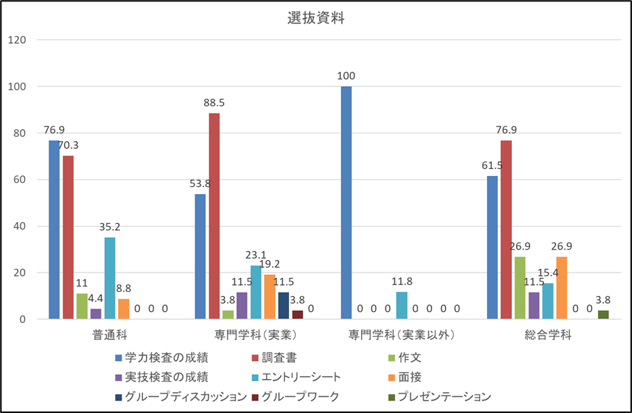 普通科・専門学科(実業)・専門学科(実業以外)・総合学科で大別している。ここでいう専門学科(実業以外)とは、文理学科等を指す。各校、複数の選抜資料を採用しているので、大別された高校数を分母として、パーセンテージで採用割合を示した。例えば、