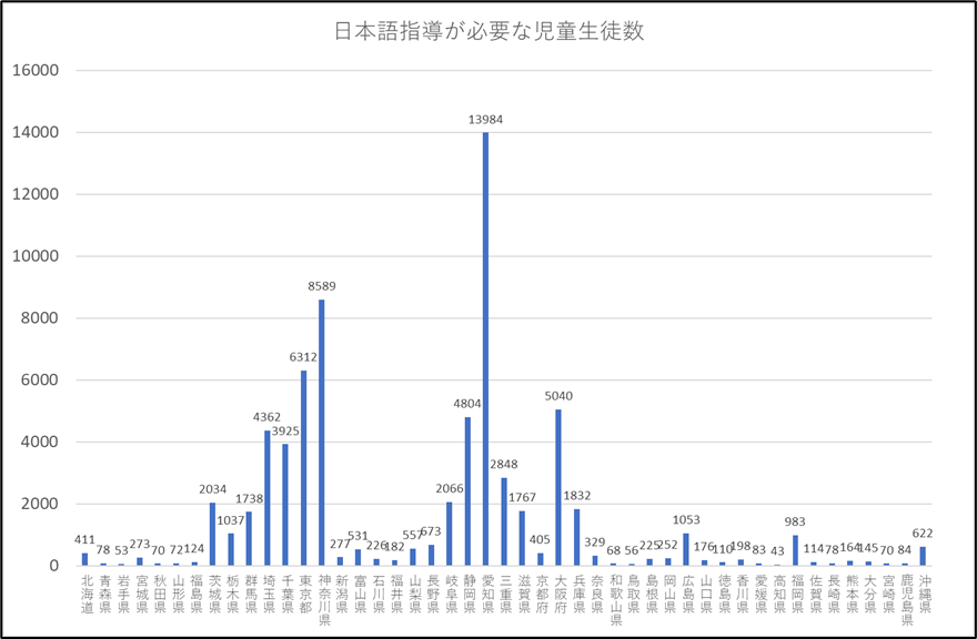 1月6日の連載記事は、外国にルーツをもつ子どもたちの話だ。都道府県別の「日本語指導が必要な児童生徒数」が示されていた。それが、下のグラフだ。