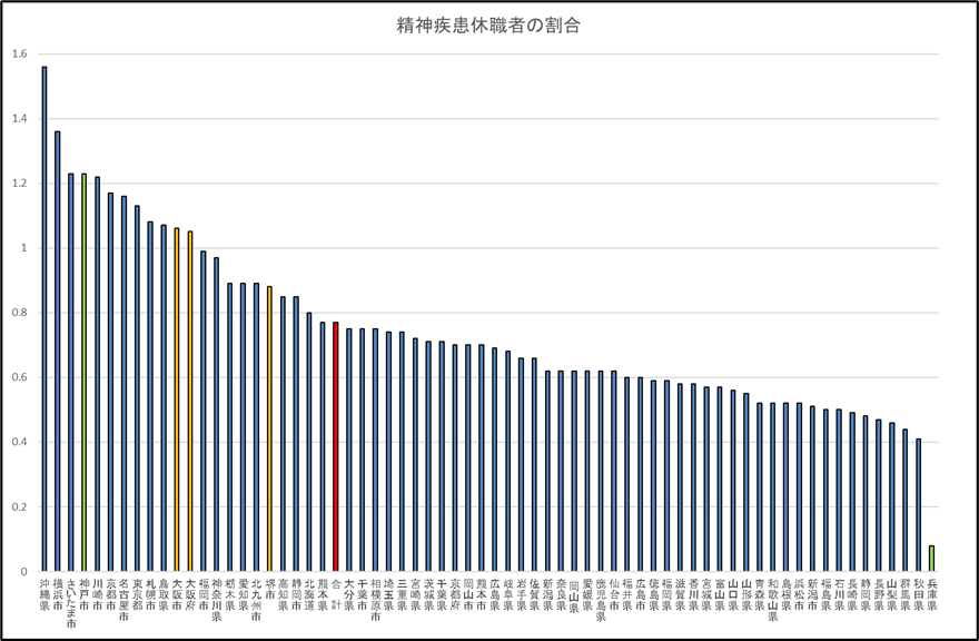 細かいグラフなので分りにくいが、「合計」と記した赤棒が全国平均の0.77%である。私の住んでいる大阪府は、政令指定都市である大阪市、堺市とともに、全国平均を上回っている。全体的な傾向として都市部の精神疾患休職者の割合が高いように思うが、沖縄県の1.56%は群を抜いて高い。沖縄県特有の事情があるように思う。もし、沖縄県で教育に携わる人で、この投稿を見た方がおられたら、何かコメントをしていただけたら嬉しく思う。
