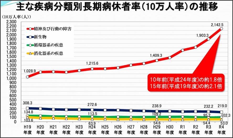 一目で、地方公務員の精神疾患による休職者は急増していることがわかる。令和4年度で見ると10万人換算で2142.5人ということは、パーセンテージに変換すると、2.14%に達する。令和4年度の教職員の場合は、0.77%であることを考えると、3倍弱という数値だ。このように比較すると、教職員における精神疾患休職者は、一概に多いとは言えない。