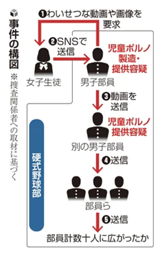2月12日から各メディアで、日大三高野球部で女子生徒のわいせつ動画が拡散されたことが報道されている。報道によると、二人の野球部部員が、児童買春・児童ポルノ禁止法違反(製造、提供)容疑で東京地検立川支部に書類送検されたとのことだ。読売オンラインでその構図が次のように図式されている。