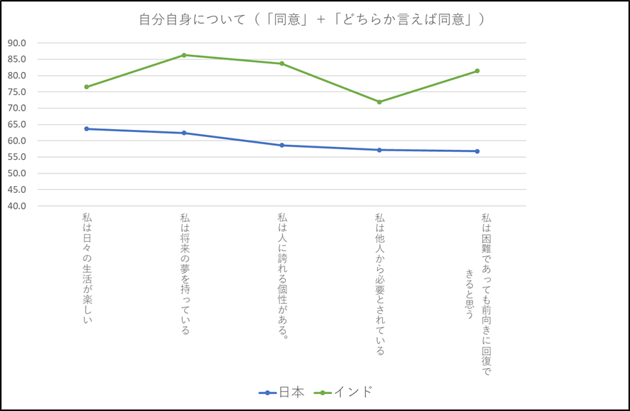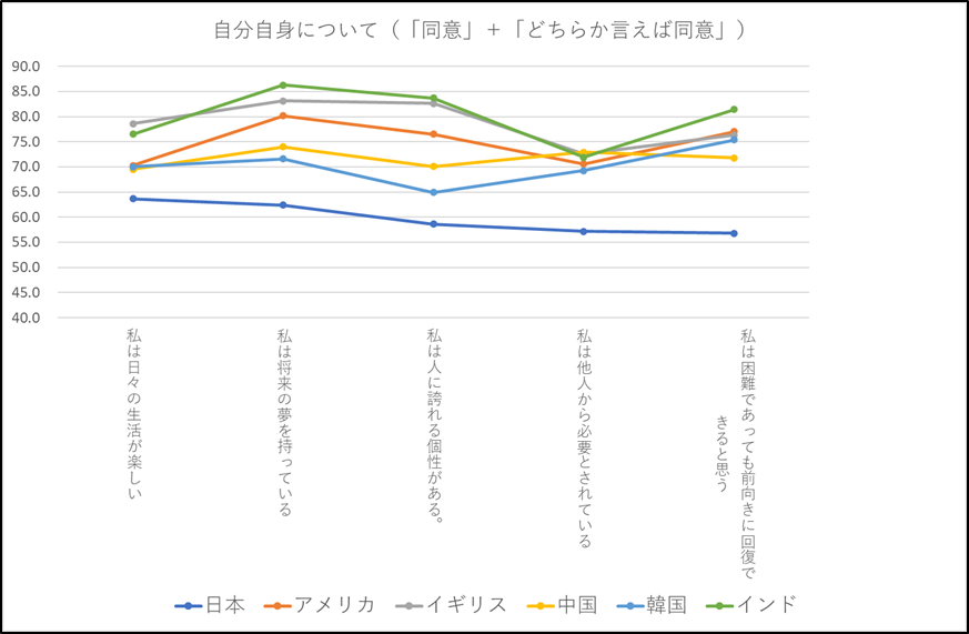 いずれの質問も自己肯定感についての問いであるが、6か国の中で全ての問いに対して、日本の若者が最低の値となっている。特に、「私は困難であっても前向きに回復できると思う」という問いに対しては、5ヵ国と日本の差が著しい。トップの成績のインドとは、24.6ポイントの差、5ヵ国最低の中国との差も15ポイントの差がある。これは、統計的分析をしなくても、「有意な差がある」と誰しもが思うだろう。