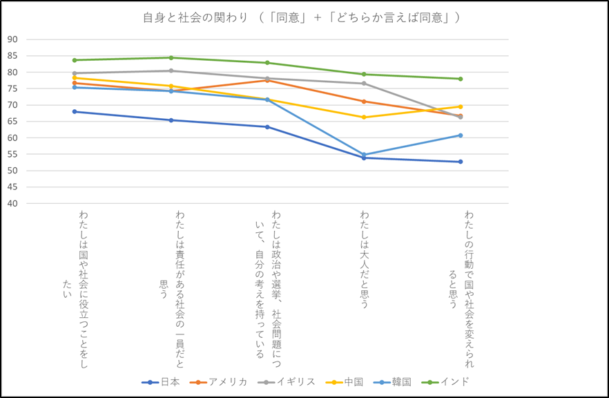 次のグラフが、自身と社会の関わりである。この結果も全ての項目で、6か国中で日本は最低の結果である。「私は大人だと思う」という項目以外、5ヵ国と日本の間では有意な差がある。