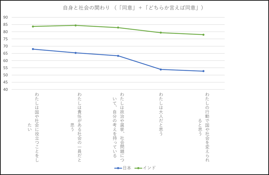 「わたしの行動で国や社会を変えられると思う」という項目では、25ポイント以上の差だ。日の出の勢いのインドと、斜陽国日本の差なのだろう。こういうところにも日本の問題がある。
