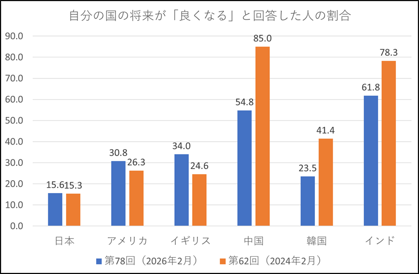 面白いのは、中国である。2024年では85.0%が「良くなる」と回答していることに対して、2026年では54.8%に落ち込んでいる。30%以上の下落である。中国では大学を出ても就職先の目途が立たず、失業者が多数出ている。いわゆる「寝そべり族」である。中国の経済の問題が、この調査結果からもうかがえる。