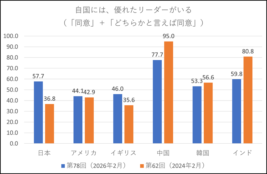 「自国に優れたリーダーがいると思う」についての肯定感が以下のグラフである。なかなか面白い。日本が、2024年2月に比べて、大幅に増えている。20.9ポイントの増加だ。2024年2月の総理大臣は誰かというと、石破首相である。2026年は当然のごとく高市首相。若者が日本のリーダーをどのように見ているのかを端的に示している。
