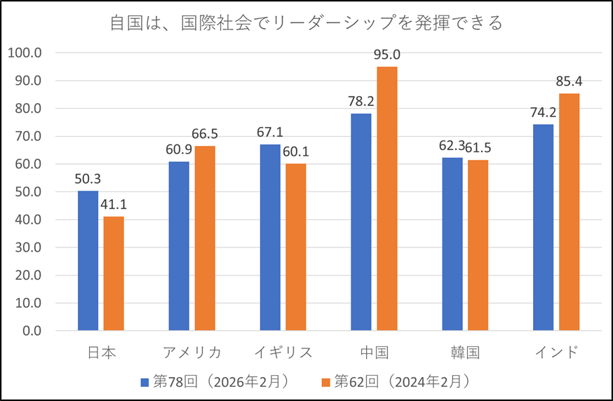 次に示すのが、自国が国際社会でリーダーシップを発揮できるかという質問に対する結果である。これも日本は肯定感が伸びていることに対して、中国・インドが減少している。2の結果と連動しているようだ。日本は、高市首相への期待が大きいと思われる。ここにもその結果が表れていると思う。
