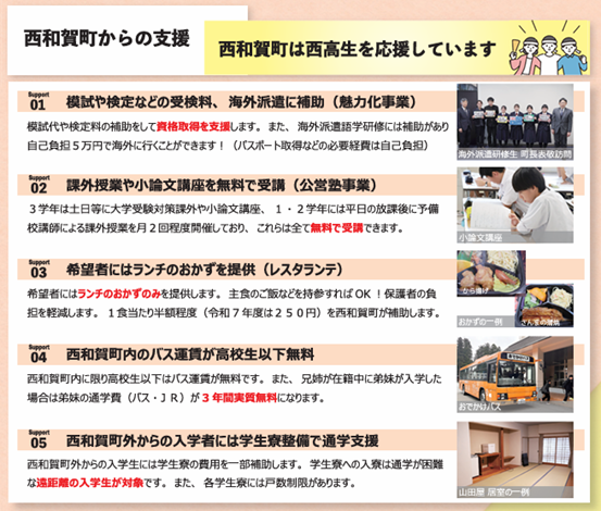 西和賀高校のwebpageは以下の通りである。是非訪れてほしい。岩手県の中でも秋田県との県境にある豪雪地帯にある学校なのだ。大阪に住んでいる感覚だと、真っ先に定員割れが続き、廃校の対象になるのではないかという学校である。その学校が、少人数であるが故の特色ある教育を実践しており、県外からも入学生を受け入れ、以前よりも生徒数が増加しているのだからびっくりである。その学校経営の決め手は、地域連携・地域支援である。地域の支援は、学校案内にも掲載されているので、以下に掲載する。