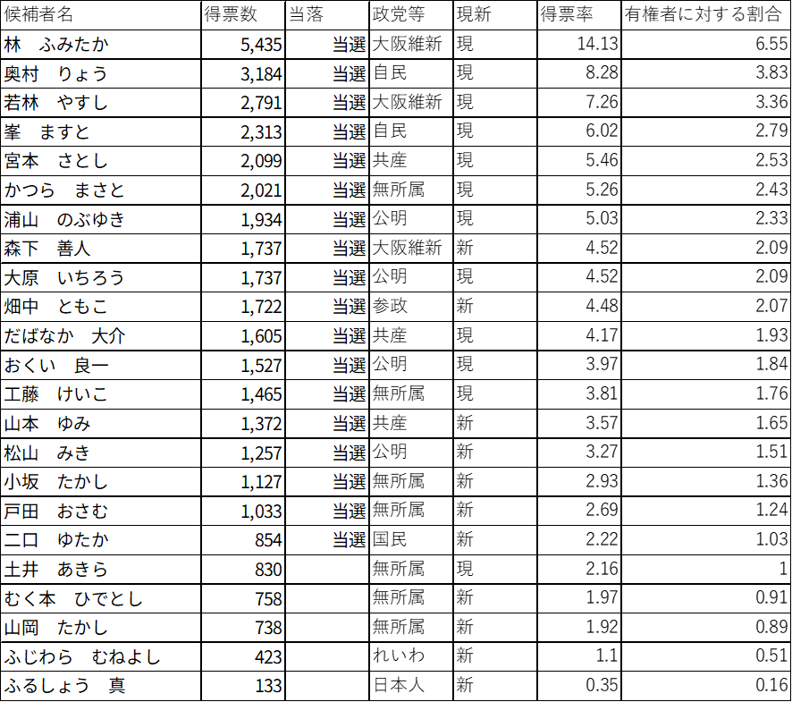 れいわ新選組から出馬した藤原氏は、最下位は免れたものの、わずか423票しか獲得できなかった。全国政党の支援を受けた他の立候補者は全員当選していることを考えると、れいわ新選組の不人気は、ここ河内長野市でも影響していると言えるだろう。参政党から新人で立候補した畑中氏が、1722票で当選したことと比べても象徴的である。