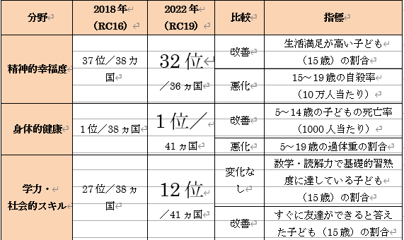 2020年9月に発表されたレポートカード16(以下、RC16)は、日本にとっては衝撃の内容であった。日本の子どもの身体的健康は1位であったが、精神的幸福度は38か国中37位のワースト2位という事だった。このことを記憶にとどめている方もおられるだろう。