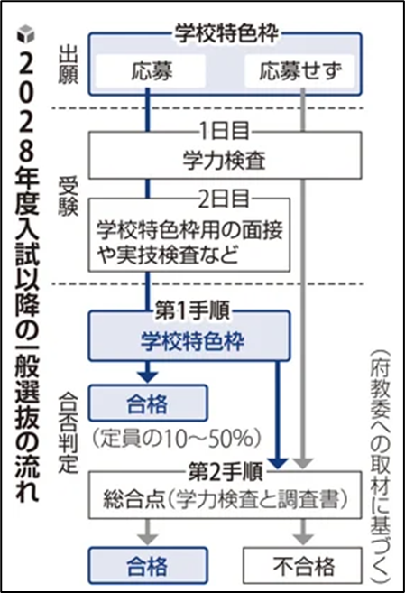 12月5日、大阪府教育委員会が、現在の中学1年生が受験する2028年度の公立高校入試の新制度を巡り、新たに導入される「学校特色枠」について、求める生徒像や選抜方法を府のウェブサイトに公表した。どのような入試制度であるかについては、下部のwebから確認していただきたいが、概略は、読売新聞が提示した次の図になる。