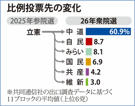2月16日の毎日新聞のネット記事で、参院選で立憲民主党に投票した人のうち、衆院選で中道改革連合に投票した人は6割にとどまり、4割は自民党やチームみらい、国民民主党など他党に流れていた棟報じられた。図式すると次のようになる。