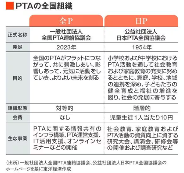 記事には、PTA活動に関する新しい動きも紹介されていた。23年1月、新たに「一般社団法人 全国PTA連絡協議会」(以下、全P)が誕生したというのだ。この話は知らなかった。全Pと日Pの違いを記事では以下のようにまとめている。